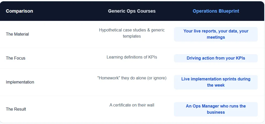 I review your current reports and dashboards. I identify exactly where your Ops Manager is hiding behind vanity metrics and teach them to see the real numbers.